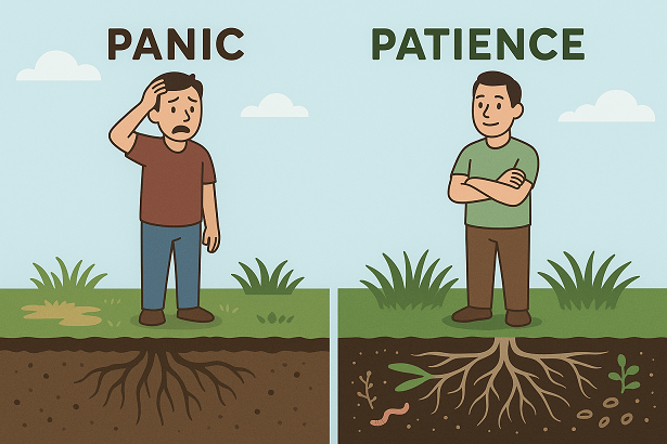 The instinct to panic usually leads people to chase quick fixes: dumping on extra fertilizer, overwatering, or buying whatever product a big box store is promoting that season. While these approaches may give the illusion of improvement, they often just mask the real issue. Worse, they can create long-term problems like soil compaction, thatch buildup, or nutrient imbalance.
