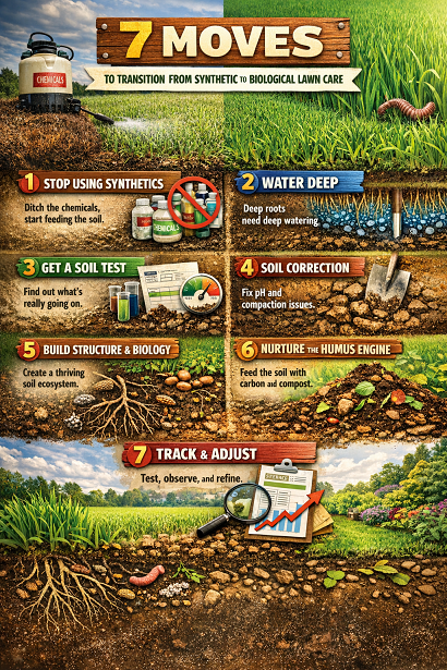 If you’ve been living in the synthetic system, you already know the deal: quick hits, constant inputs, and a lawn that looks “fine” until it doesn’t. Then you’re chasing problems—dry spots, disease, weeds, compaction, thatch—while paying more every season for less stability.
